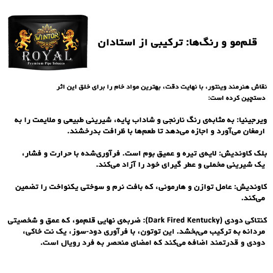 توتون کنتاکی که در ترکیب «رویال» وینتور استفاده شده، نوعی برگ تنباکوی تیره است که اصالتاً در ایالت کنتاکی آمریکا کشت میشود.